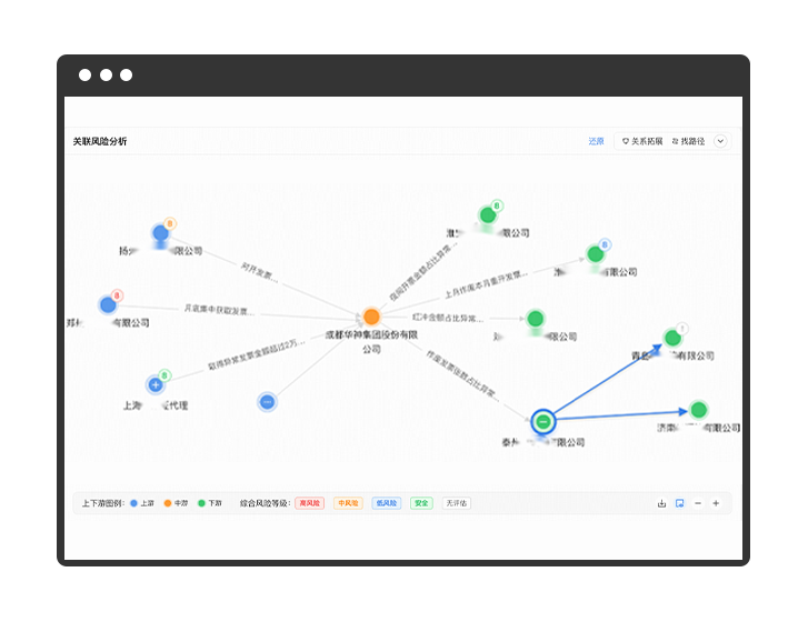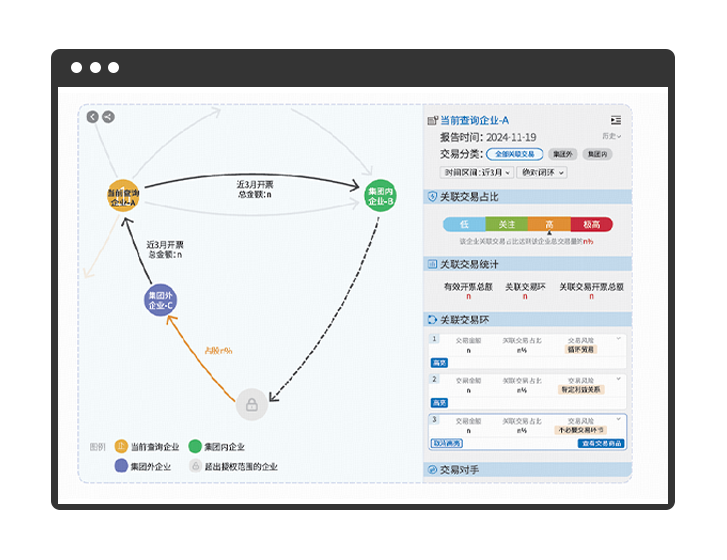 基于企业交易发票、工商、股权数据,构建关联反欺诈图谱,通过图算法识别可疑交易模式,输出交易闭环、关联交易指标及可视化结果,并精准挖掘与目标企业直接/间接关系的关键信息,构建完整交易画像,识别多类型虚假贸易模式,帮助企业向贸易智能合规升级