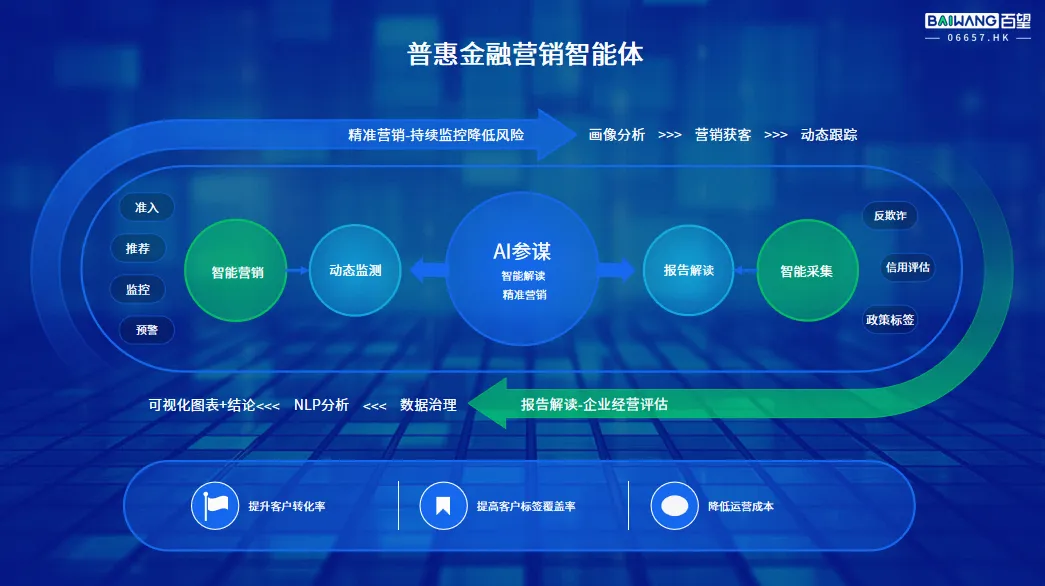 依托百望股份的深厚的数据风控与技术沉淀,该智能体借助先进的大数据与人工智能技术,全面提升金融业务的客户触达与数字化服务能力、实现了智能化端到端的服务与产品能力,为金融机构更好平衡营销与风控、高质量服务金融客户,创造了更加数智化、线上化的全场景能力。