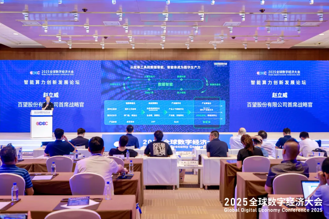 当日,“2025全球数字经济发展大会—智能算力创新发展论坛”同步举办,百望股份受邀出席。赵立威与参会嘉宾深度探讨了算力向生产力转化的实践。他指出,垂类大模型驱动的数据智能正在重构数字生产力,推动产业智能化升级。百望股份通过“百望大脑”融合多种模型与数据资源,为金融、税务等多领域提供智能解决方案,并展示了金融业务智能体等百望创新应用。