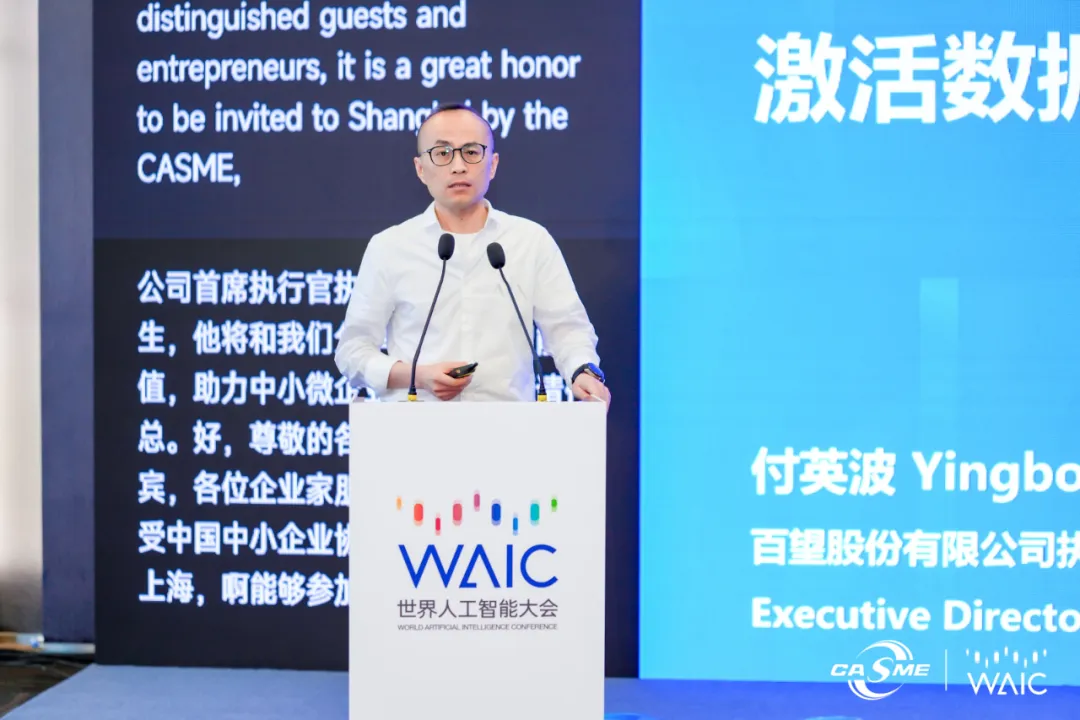 在同期举办的“AI For SME——人工智能赋能中小企业高质量发展”论坛上,付英波发表了《激活数据智能价值,助力中小微企业数智化发展》主题演讲,向与会嘉宾阐述了百望股份“以数据为基、场景为锚、大模型为引擎、智能体为触手,探索具有中国产业特色的AI深度赋能中小企业发展的深度实践”。