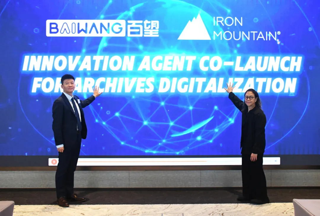 发布会上,百望股份CMO邹岩与铁山东北亚区副总裁兼大中华区总经理吴美宝联合发布档案数字化创新智能体。