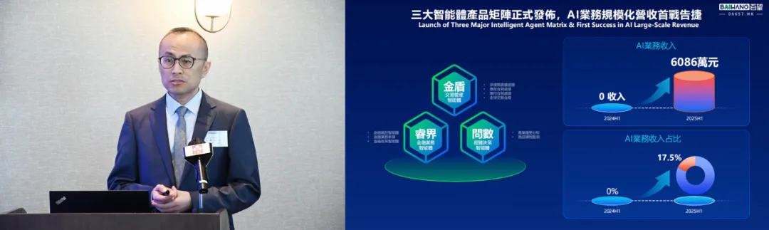 在推介会上,百望股份CEO付英波披露的数据印证了百望战略的前瞻性:2025年上半年,公司营收达3.476亿元,同比增长23.5%;毛利率提升至46.6%;AI相关业务收入突破6086万元,占比17.5%。这一业绩表明,百望已成为中国少数率先实现AI规模化落地的企业服务公司。