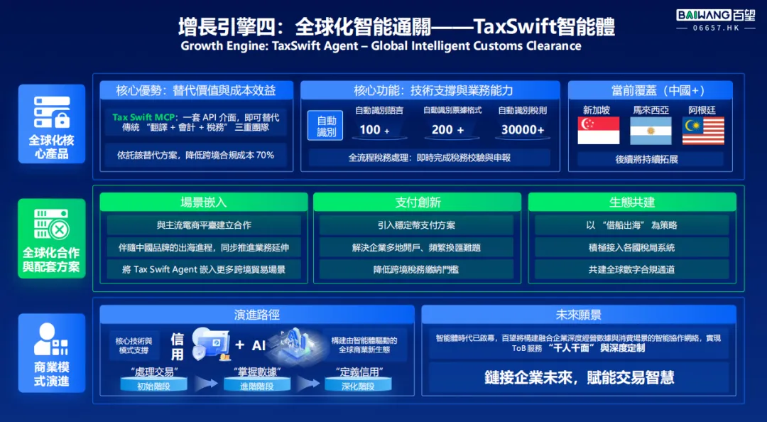 通过“Tax Swift MCP”平台,百望可自动识别100多种语言、200多种票据格式、3万条税则,大幅降低跨境贸易的人力成本、时间成本和合规成本。目前百望的产品已在新加坡、马来西亚、阿根廷等市场进行试水,并有望加速拓展至东南亚和中东地区。