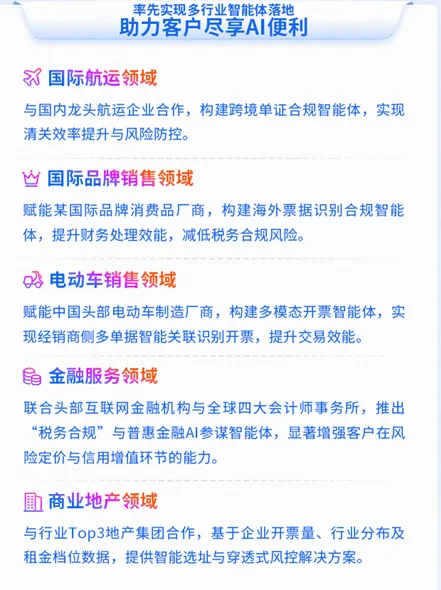 此外,百望股份已与多家链主企业共建“联合创新实验室”,在智能制造、商业地产、国际物流等领域落地智能体应用,实现了从“客户共建”到“场景共创”的深度融合,行业案例数量与质量均处于领先地位。