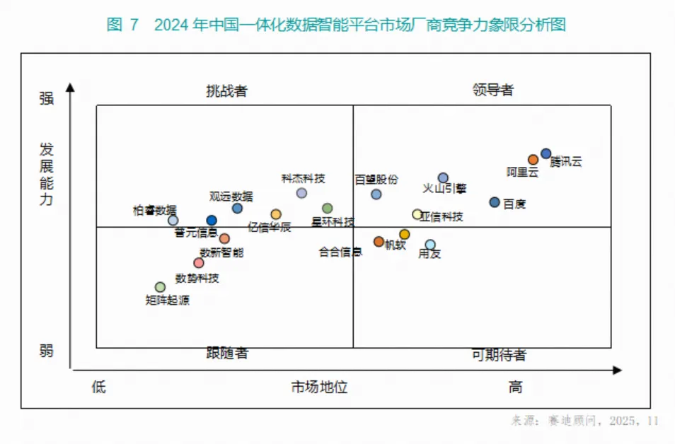 根据赛迪报告,2024年中国数据智能市场规模已达258.6亿元,同比增长高达43.2%,展现出强劲的增长势头。市场结构上,数据智能基础设施、平台与解决方案三大板块协同发展,其中一体化数据智能平台成为增长最快的细分领域。