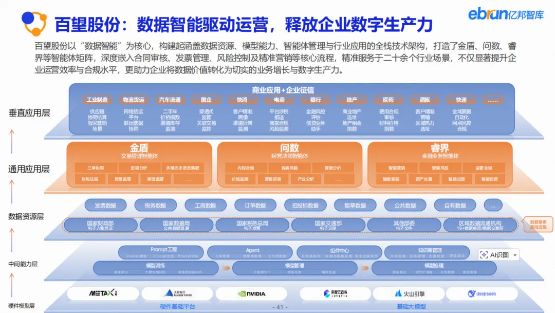 正如亿邦动力在《2025年产业互联网发展报告》中指出的,新周期的产业互联网需要“可验证、可持续的价值创造”。百望股份智能体产品矩阵背后,是公司深耕10年构建的数据护城河——231亿张发票、1055万亿元交易数据、9070万纳税人识别号——这组沉甸甸的数据背后,正是百望股份从财税数字化到产业智能基建的蜕变之路,为产业互联网打开了全新增长空间。