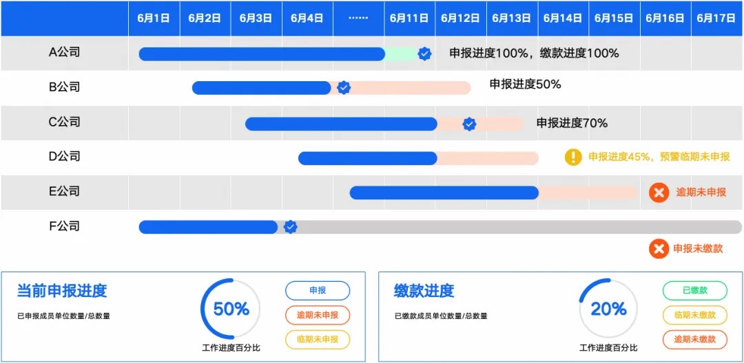 首先,在全面归集的税务信息基础上,平台能够直观分析各个子公司税局风险触发、风险应对情况、整体申报进度以及欠税信息等,并生成完善的风险异常展示面板,帮助集团、成员单位了解详情。