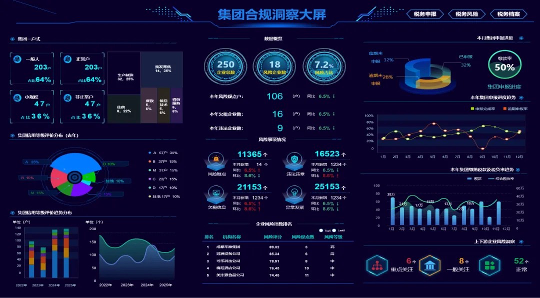 集团层面,管理者看到的是一张“合规全景图”。通过可视化看板,可以直观掌握集团整体的税务风险分布、成员单位信用等级变化、风险类型集中情况以及申报进度状态,帮助管理层快速识别重点风险区域,提前部署资源,而不是等问题发生后再被动应对。