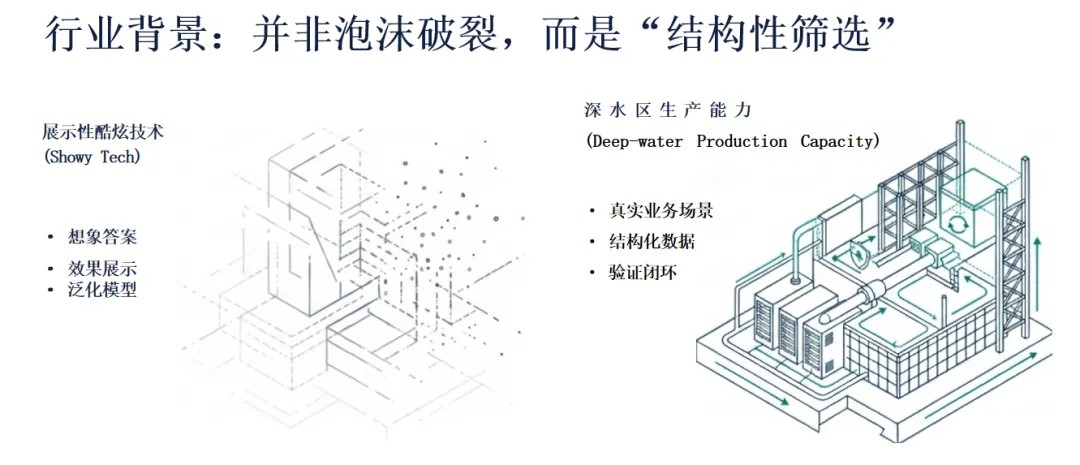 这种筛选机制正在将AI赛道划分为泾渭分明的两个世界:一个是依赖概率预测、以内容生成和效果展示为主的“轻量级AI”,它们在冷却周期中面临出清;另一个则是能够对接结构化数据、嵌入专业逻辑、在真实业务场景中形成闭环的“产业级AI”。
