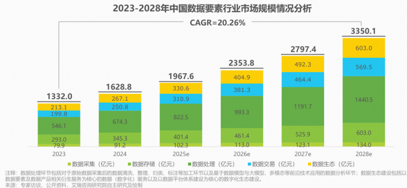 当数据成为新时代的“数字黄金”,一场价值千亿的数据要素价值重构正在发生。根据艾瑞咨询的研究报告显示,国内数据要素行业规模将以约20.26%的复合增长率保持高速增长,预计2025年整体规模将达到2000亿左右,其中以数据加工与分析为核心的数据处理环节更将以1440亿元的规模领跑产业生态,展现出技术赋能下的指数级增长潜力。